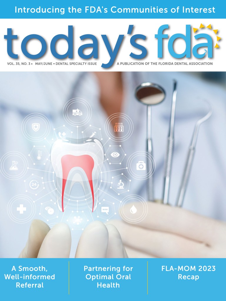 The 2023 May/June issue of Today’s FDA is available online for Florida Dental Association (FDA) members NOW! This issue introduces the FDA’s Communities of Interest – an online platform focused on active discussion and sharing of information about specific topic areas. So, what are you waiting for? Head to floridadental.org/publications or just click the cover image below to read the issue.