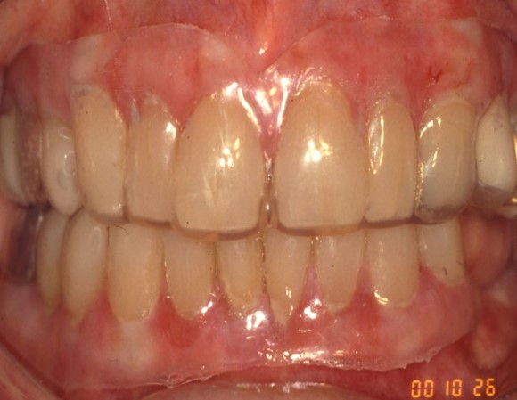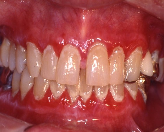 Figure 3-5: Mucous membrane pemphigoid (MMP) presenting as desquamative gingivitis; poor plaque control resulting from the inability to brush comfortably; patient responded well to topical steroids applied in delivery trays.