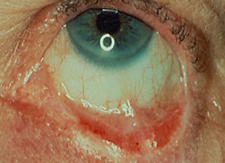 Vesiculobullous lesions occasionally occur on other mucosal surfaces such as the conjunctiva, genitals, skin, nares, esophagus, urethra, and rectum. Symblepharon formation (scarring extending from the conjunctiva to the eyeball itself) can lead to blindness. (Figure 6) It is wise to refer patients for an evaluation by an ophthalmologist following diagnosis. Biopsy for routine histology and direct immunofluorescence is often necessary for a definitive diagnosis. Specimens will show a clean, sub-basilar separation of the epithelium from the underlying connective tissue.
