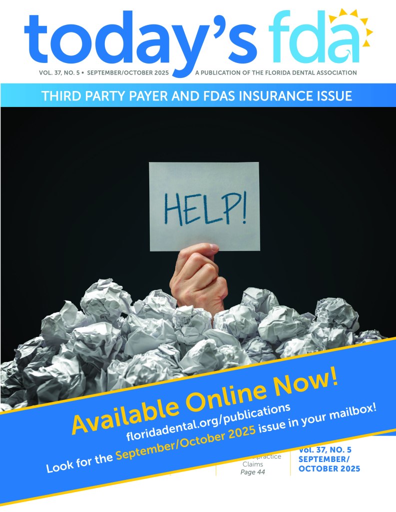 The 2025 Sept/Oct “Third Party Payer and FDAS Insurance” issue of Today’s FDA is available online for Florida Dental Association (FDA) members NOW! Check it out for a great article about Danger Zones in Employment Agreements, as well as Protecting Practices, Preserving Professions: The Insurance Solution That Keeps Dentists’ Dues Down and Characteristics of Dental Malpractice Claims. So, what are you waiting for? Head to floridadental.org/publications or click the cover image below to read the issue.