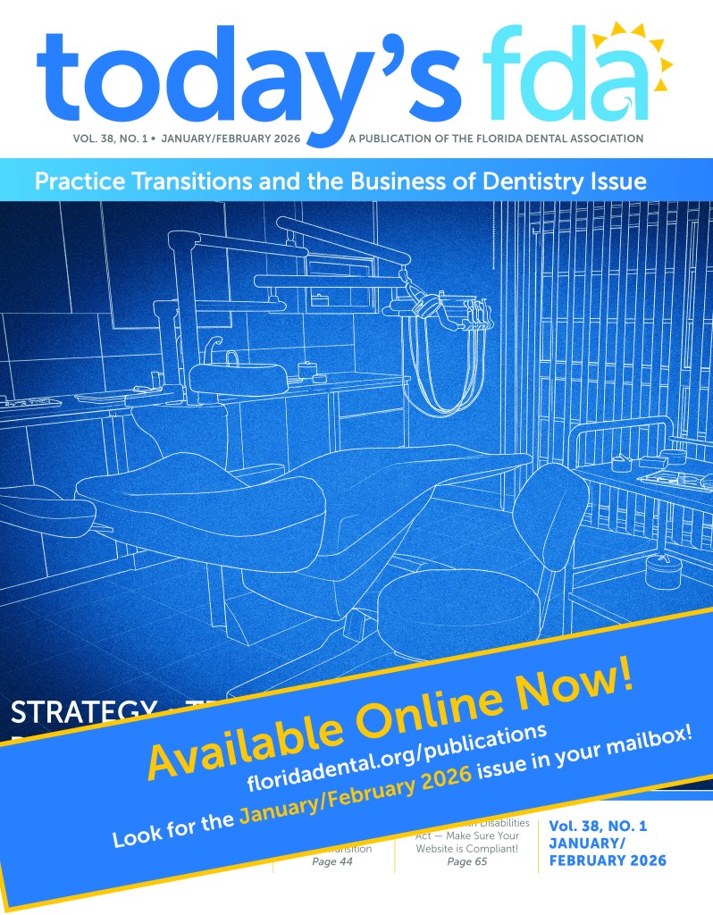 The 2026 Jan/Feb “Practice Transitions and the Business of Dentistry” issue of Today’s FDA is available online for Florida Dental Association (FDA) members NOW! Check it out for a great article about “The Overlooked Key to a Smooth Practice Transition,” as well as “The Most Overlooked Tool in a Successful Dental Transition” and “From Foundation to Future: Reflections on 40 Years of FDA Services.”